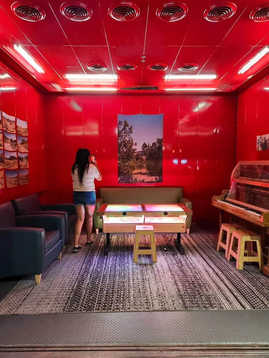 500 Unheard Legacies, Installation in Explora Museum elevator, 2023, 120 x 120 x 60 in., pigment prints on habotai silk, video, audio recordings from Jackpile/St. Anthony Mines and Interview with Jessica Begay