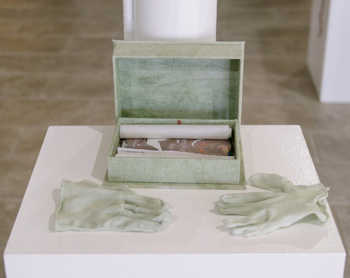 Rosalba Breazeale, Poems from Kay Pacha catalog and gloves, 2023, 5 x 7 x 3 in., Chlorophyllin dyed cotton & silk clamshell box and gloves, plant relatives scroll, essay by Calliandra Marian Hermanson, Pigment Prints on Red River Polar Luster Metallic 255, soil from Limington, ME